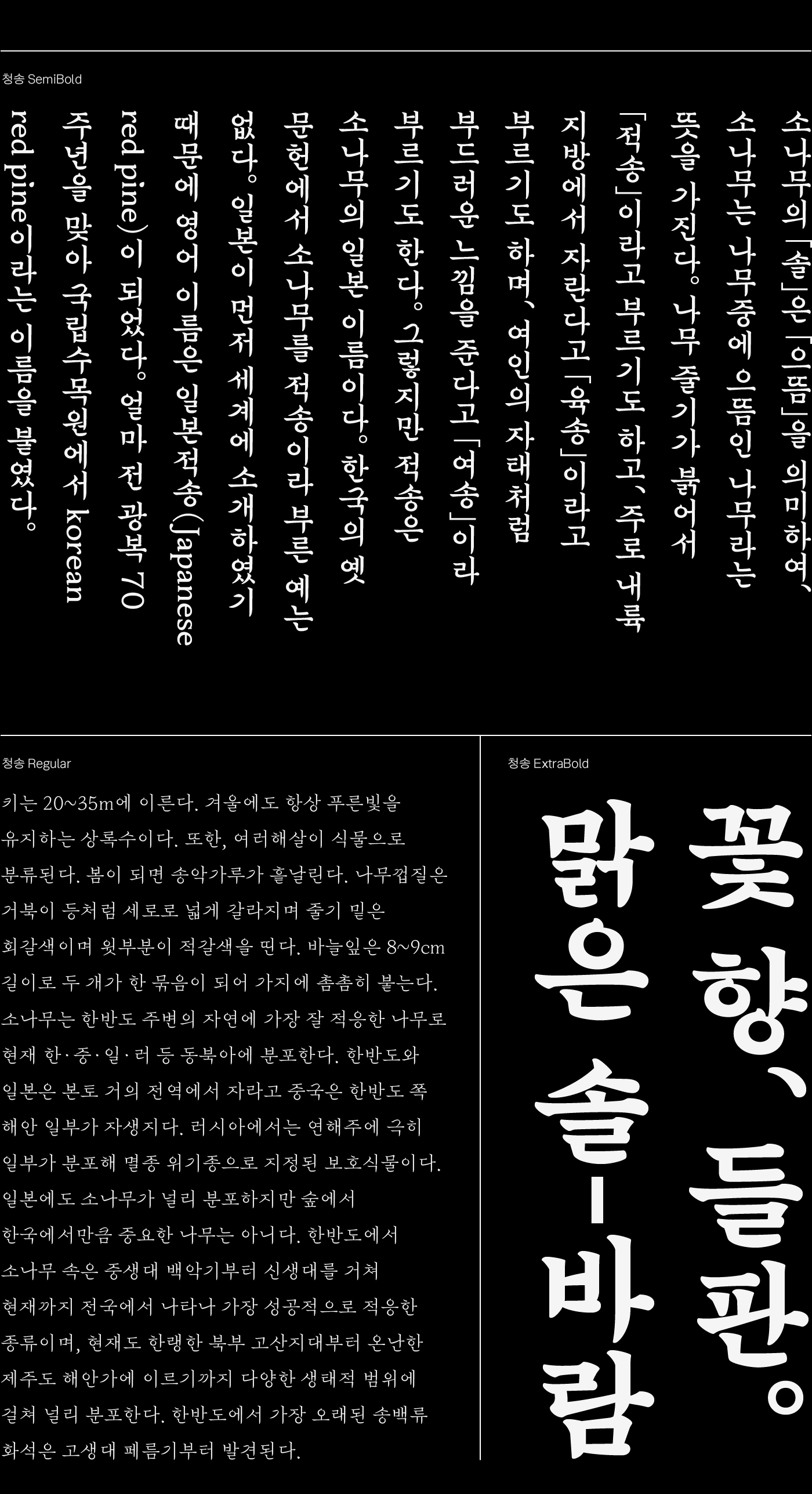또, 《청송》은 3가지 자족으로 구성되었으며, 도구에 따라 쓰기 방식부터 속도, 형태까지 달리 제작되었습니다. 2022년 8월 중필(SemiBold)이 완성되어 10월에 정식 출시되었고 2023년 2월 세필(Regular), 5월 대필(ExtraBold)이 출시, 중필과 세필의 버전도 함께 업데이트되었습니다.
