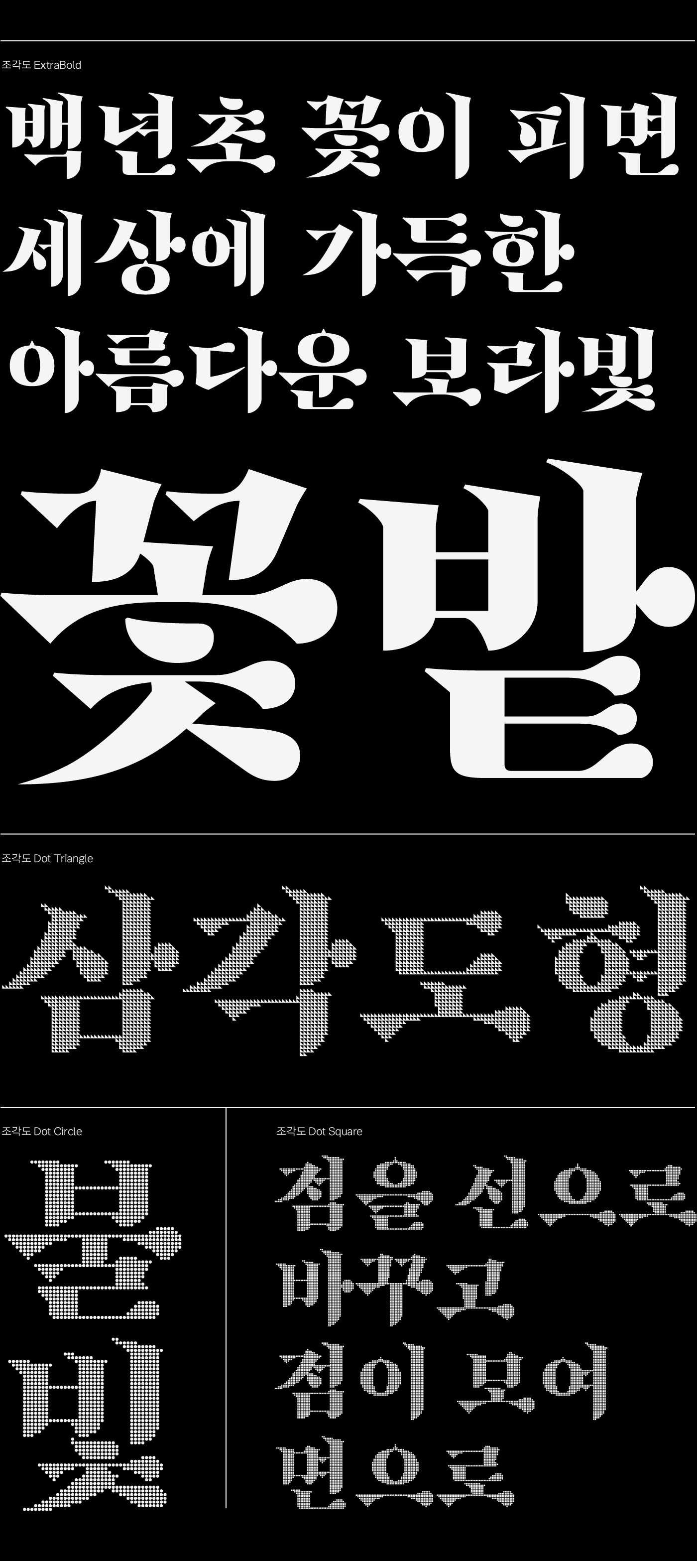 《조각도》로 표현할 수 있는 범주를 늘리기 위해, 제작한 도트 스타일은 형태와 구조를 일관된 질서로 맞췄습니다. 총 4종의 글꼴로 이루어진 《조각도》는 2023년 12월 정식 출시되었습니다.