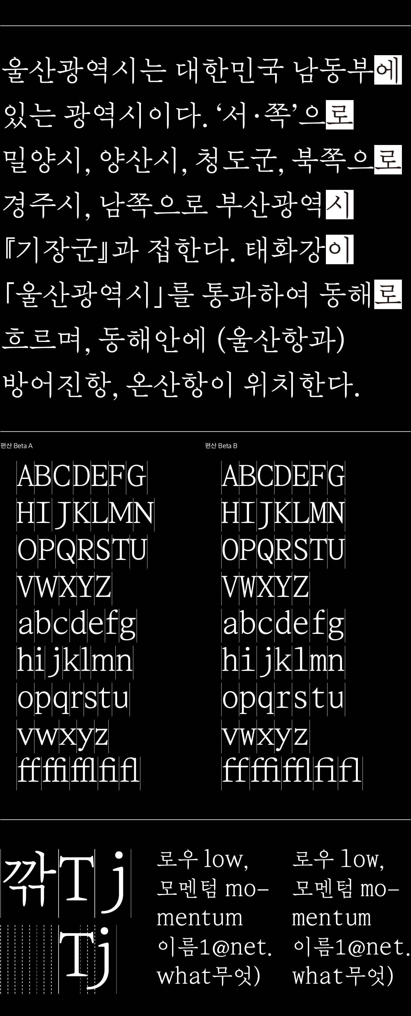 《편산》은 산작을 바탕으로 8분각 모듈 체계를 적용한 글꼴입니다. 한글 944유닛을 전각 기준으로 1/8에 해당하는 118유닛 단위로 모든 글리프가 설계되었습니다. 라틴 알파벳이 8분각 모듈로 설계된 Beta A, 고정틀 라틴 알파벳으로 설계된 Beta B로 각각 제공되며, 라틴 알파벳과 합자 5자를 제외한 글리프는 동일합니다. 사용자 의견 수렴 후 기능과 글자수를 추가할 예정입니다.
