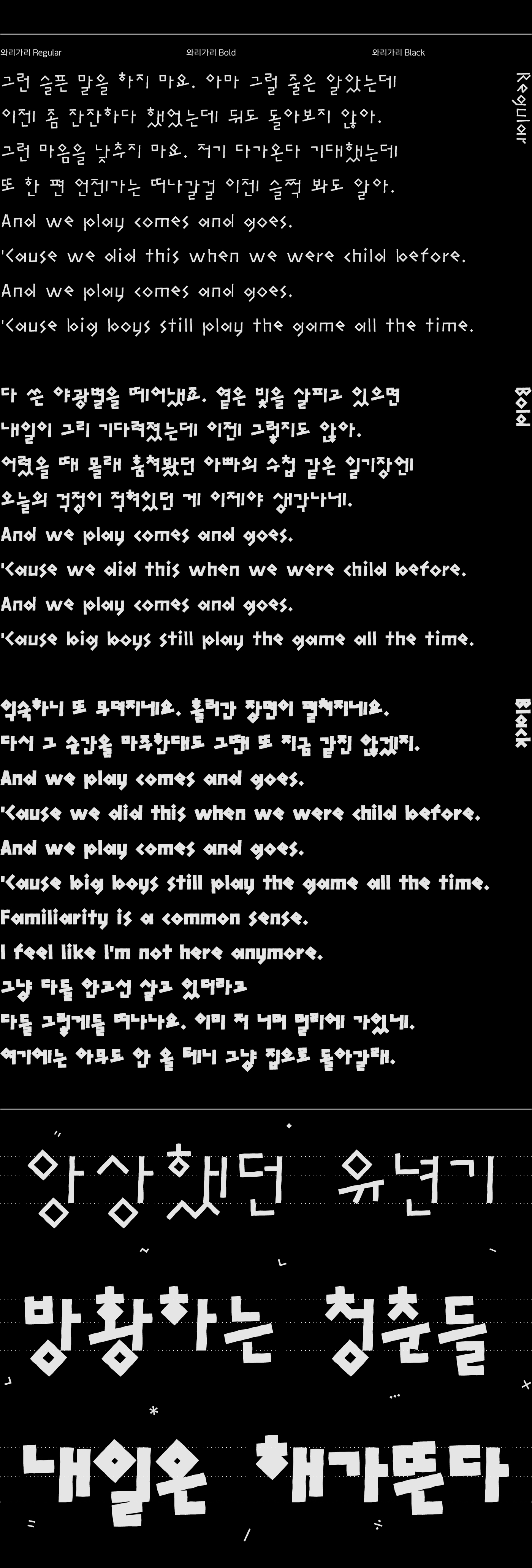 낱자의 위치가 고정되어 있기 때문에 가로모임꼴과 세로모임꼴의 받침을 공유하기 위해 가로모임꼴 기준에서는 조금 안으로 들이고, 세로모임꼴 기준에서는 우측으로 밀었습니다. 이로인해 글자의 균형축이 기울어 역동적인 모습이 나타나는데, 마치 술에 취해 비틀거리는 모습을 연상시켜 《와리가리》라는 이름을 붙여주었습니다. 글씨의 특징을 빌려 질감과 기울기, 연결의 특징이 나타납니다. 획의 질감과 기울기로 인해 낱자의 배치가 다소 엉성하게 결합되더라도 자연스럽게 보이도록 만들었습니다.